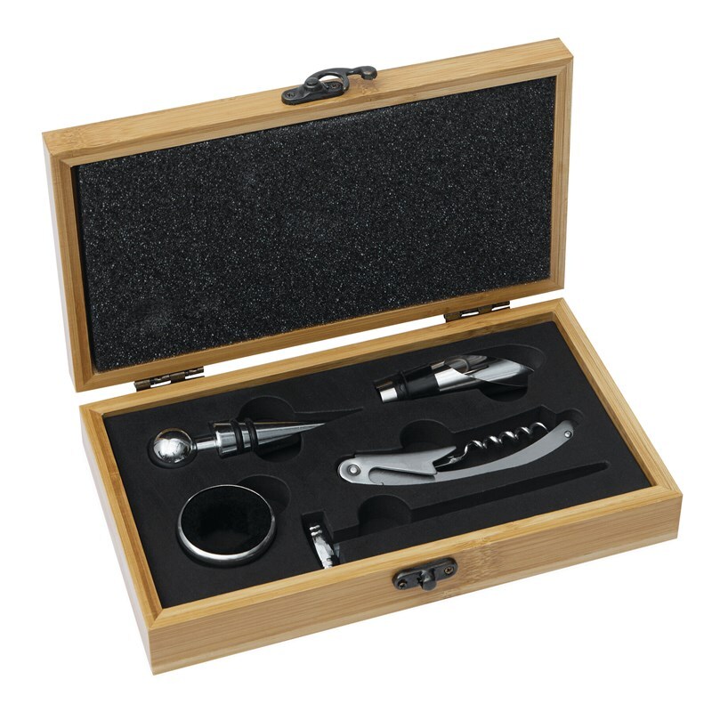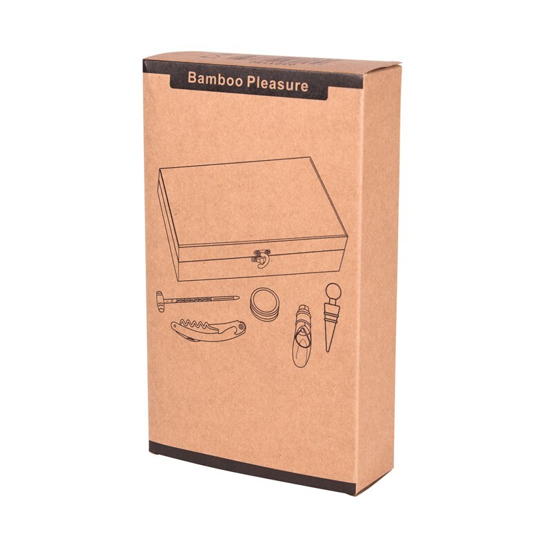 Винный набор BAMBOO PLEASURE, в бамбуковой коробке: со стеклянным термометром, кольцом сомелье из нержавеющей стали, металлической пробкой, металлическим каплеуловителем и ножом сомелье из нержавеющей стали
